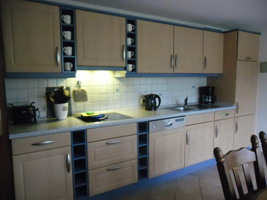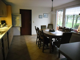Die großzügige Küche ist ausgestattet mit Mikrowelle, Backofen, Spülmaschine, Kaffeemaschine, Wasserkocher, Kühlschrank, Gefrierschrank, Radio, Geschirr. Von der Küche aus kommt man auf die Terasse.